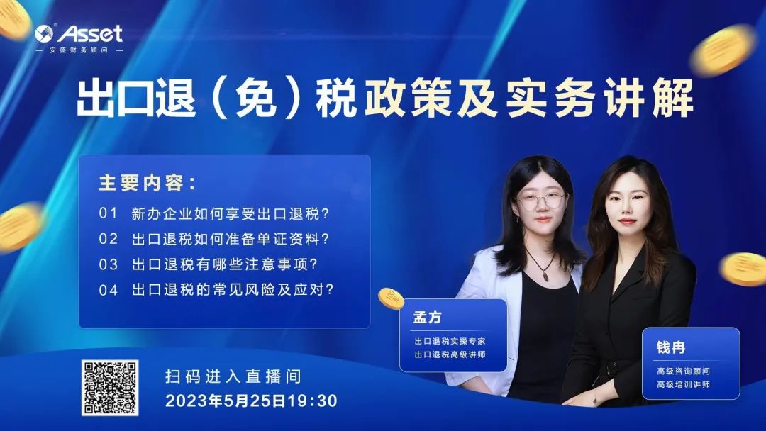 5月25日19:30,安盛財務(wù)組織開展“安盛財稅云課堂”——《出口退(免)稅政策及實務(wù)講解》直播課,本次直播邀請咨詢顧問中心錢冉老師和項目服務(wù)中心孟方老師帶來專業(yè)講解。